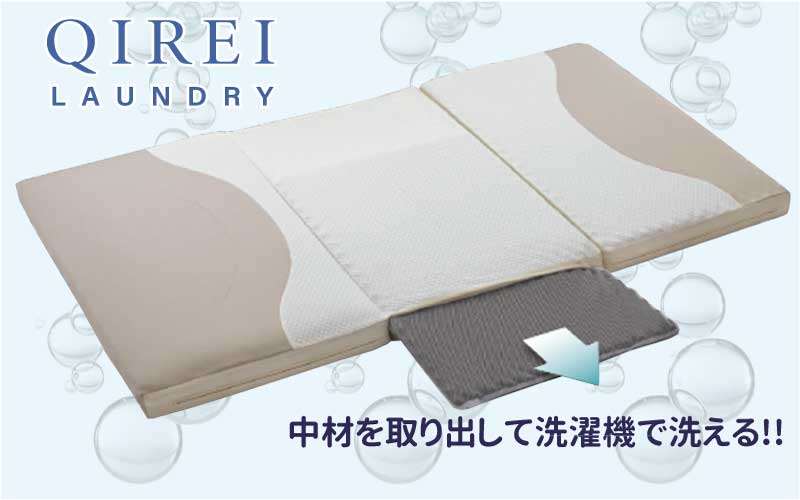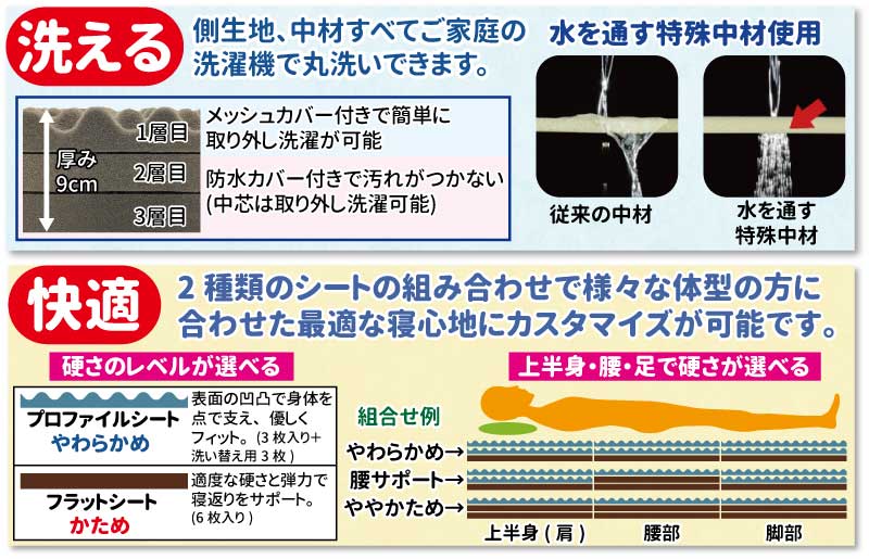 従来のウレタンフォームより水はけの良い中材を3分割することにより、手軽に取り出せ、洗うことができるマットレス。2種類の中材の組み合わせで寝心地の調節も可能。