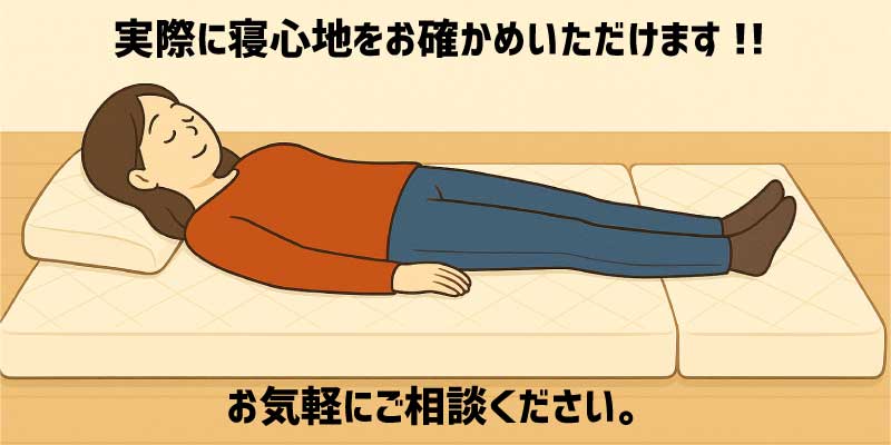 寝窓工房ユーキでは、お客様の体型や用途に合わせた敷寝具を実際にお試しいただき、ご提案させていただきます。