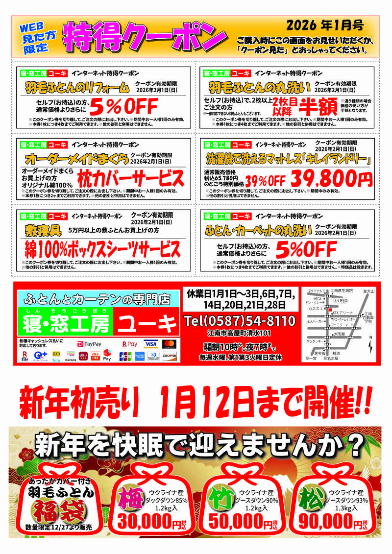 お店で使えるお得なクーポン!! ホームページを見たお客様だけに、割引やプレセント等お得にお求め頂ける特得クーポンを作成致しました。 特得クーポン2026年1月号 画像をプリントアウトして切り取ってお使いいただくか、スマートフォンにて画像をお見せください。 クーポンは、他のサービスと併用できない場合もございますので、使用する際は、できるだけ早めにスタッフにお伝え下さい。ご来店を心よりお待ちしております。 FacebookXBlueskyCopy